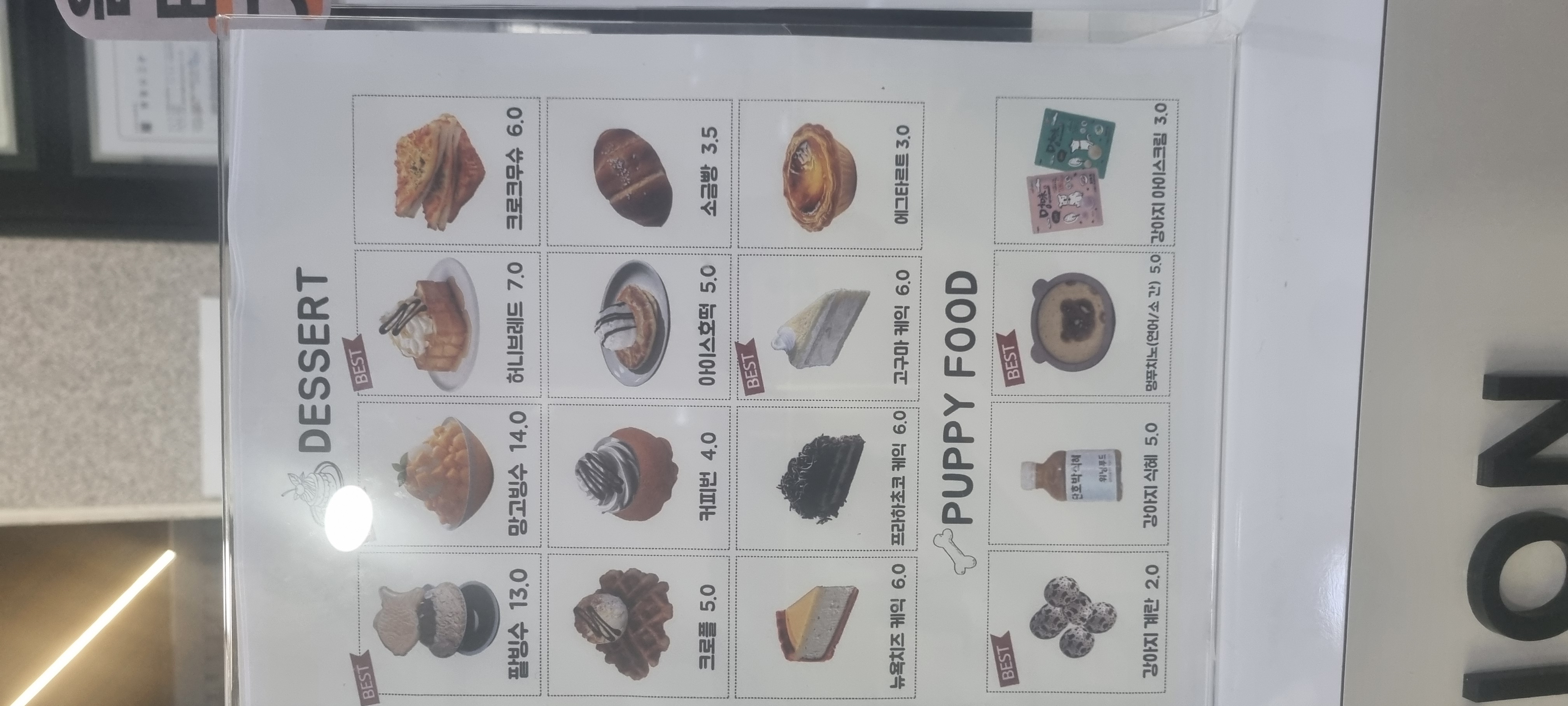 디저트랑 멍멍이들 음료랑 간식도 있어요