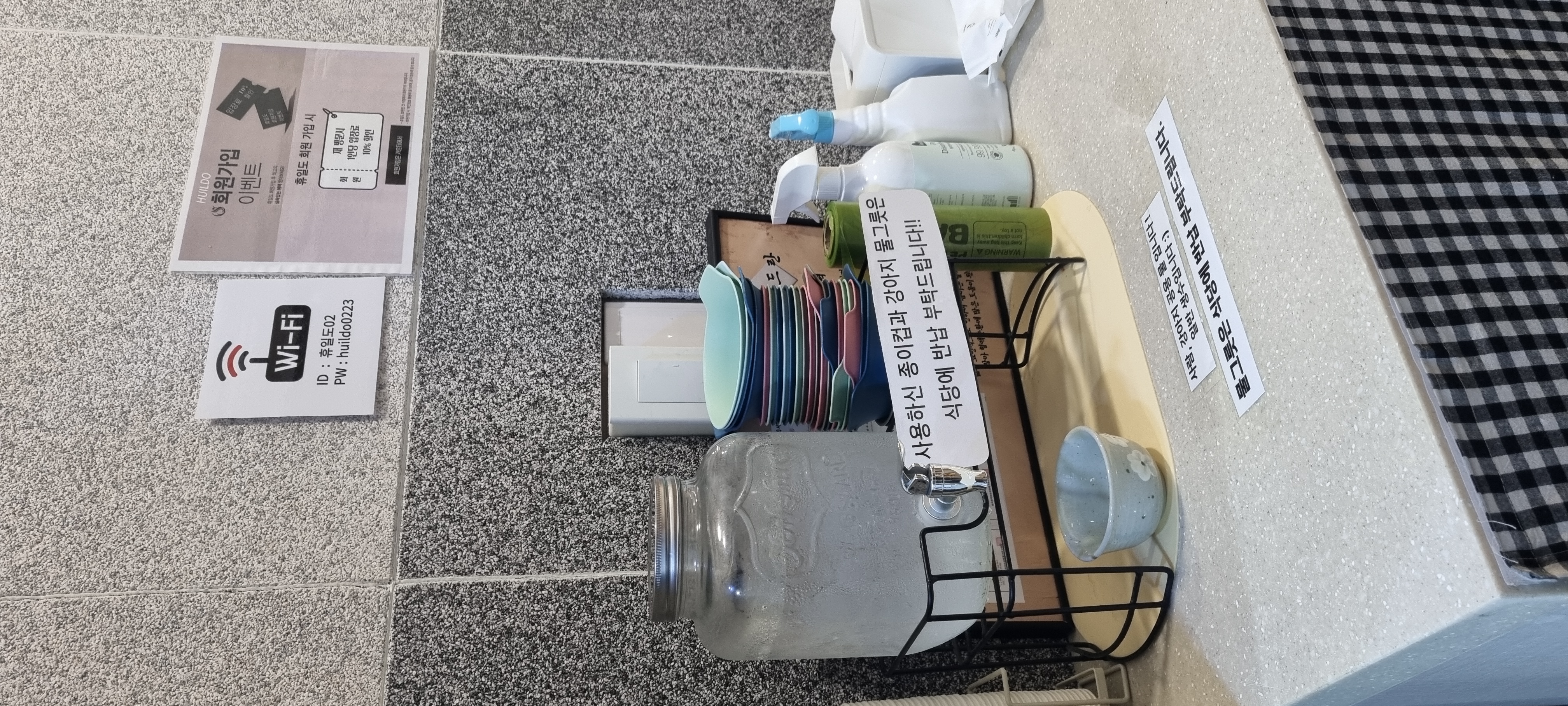 강아지가 먹을 수 있는 식수랑 비닐 탈취제 등이 마련되어 있어요