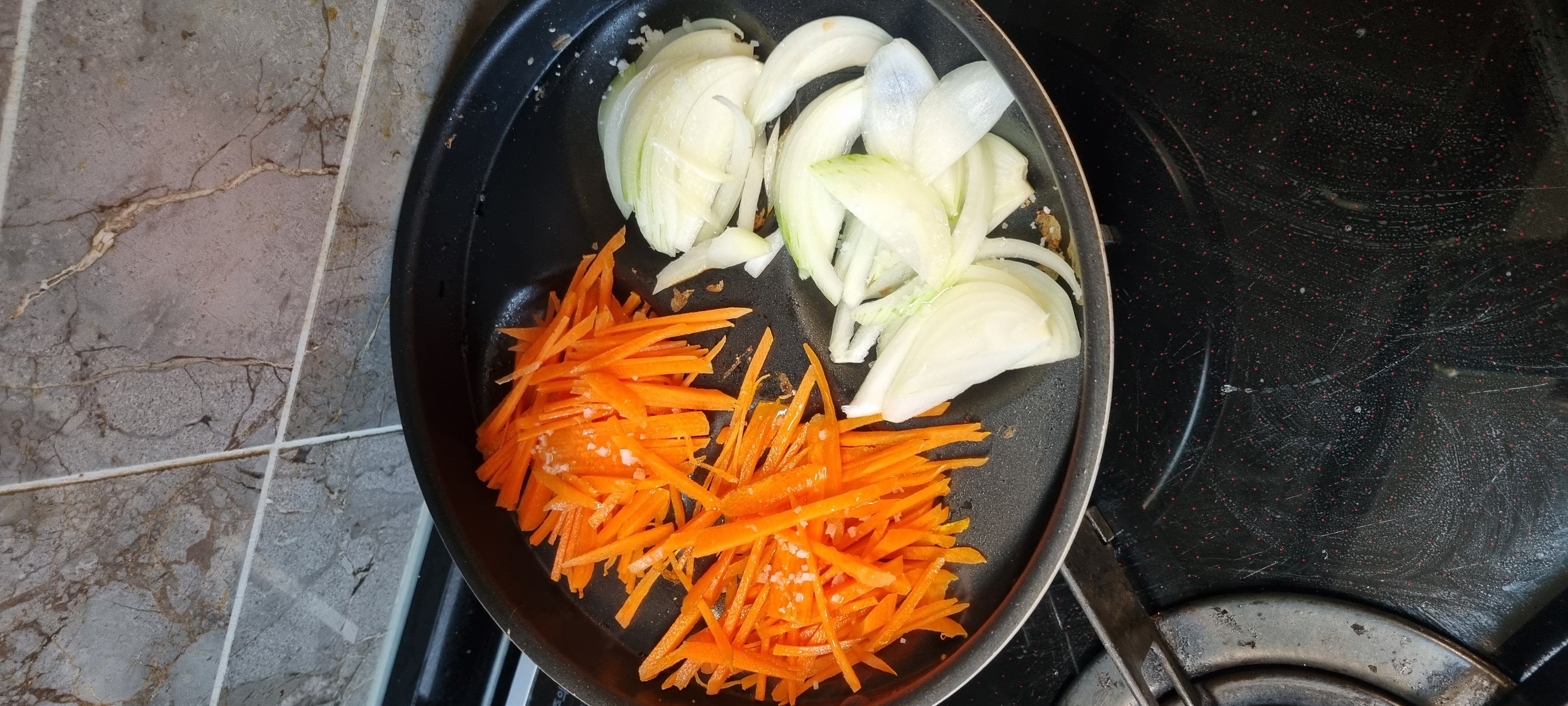 당근이랑 양파 채쳐서 천일염 굵은소금으로 간 맞추고 살살 익혀줍니다