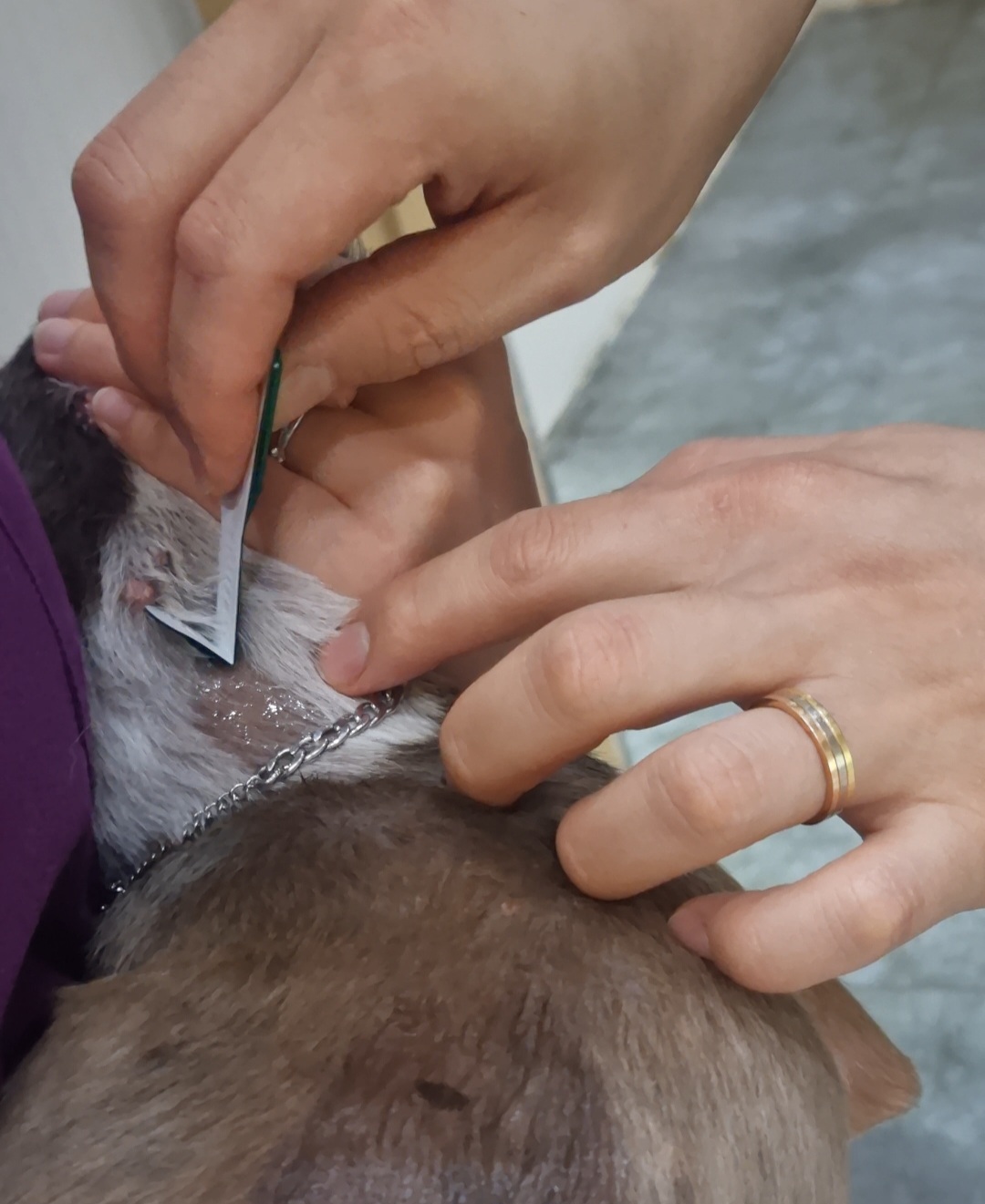 간호사님이 안고 처치실로 가서 귀 항문낭 발톱 발바닥 털제거등 기본 처치를 해 준 뒤 본격 진료에 들어가게 됩니다