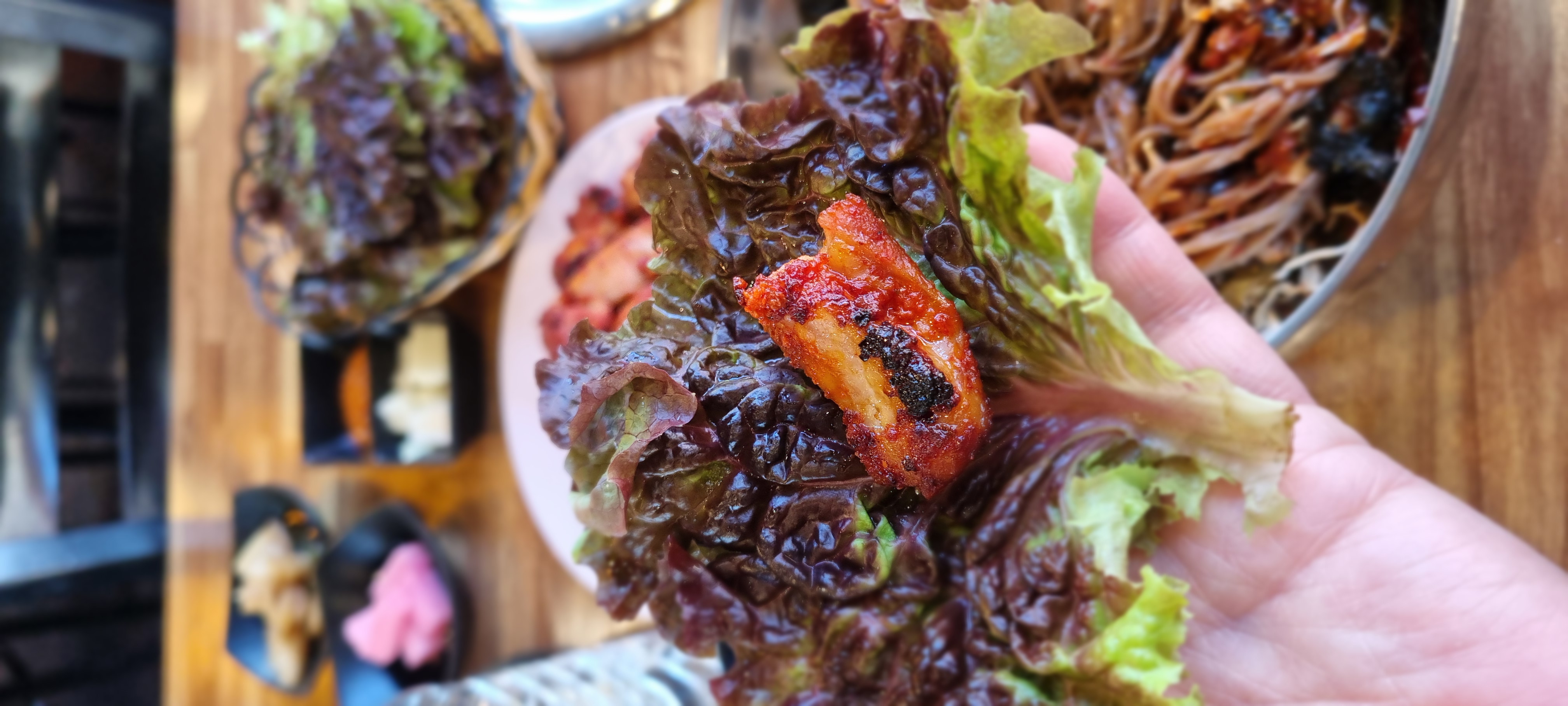 막국수에 고기 넣고 상추에 싸 먹으니 더 맛있어요