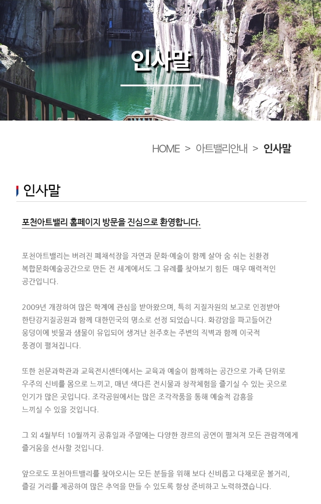 홈페이지 들어가 보니 폐채석장이었던 이곳을 아름답게 가꾸어 놓은 곳이더군요