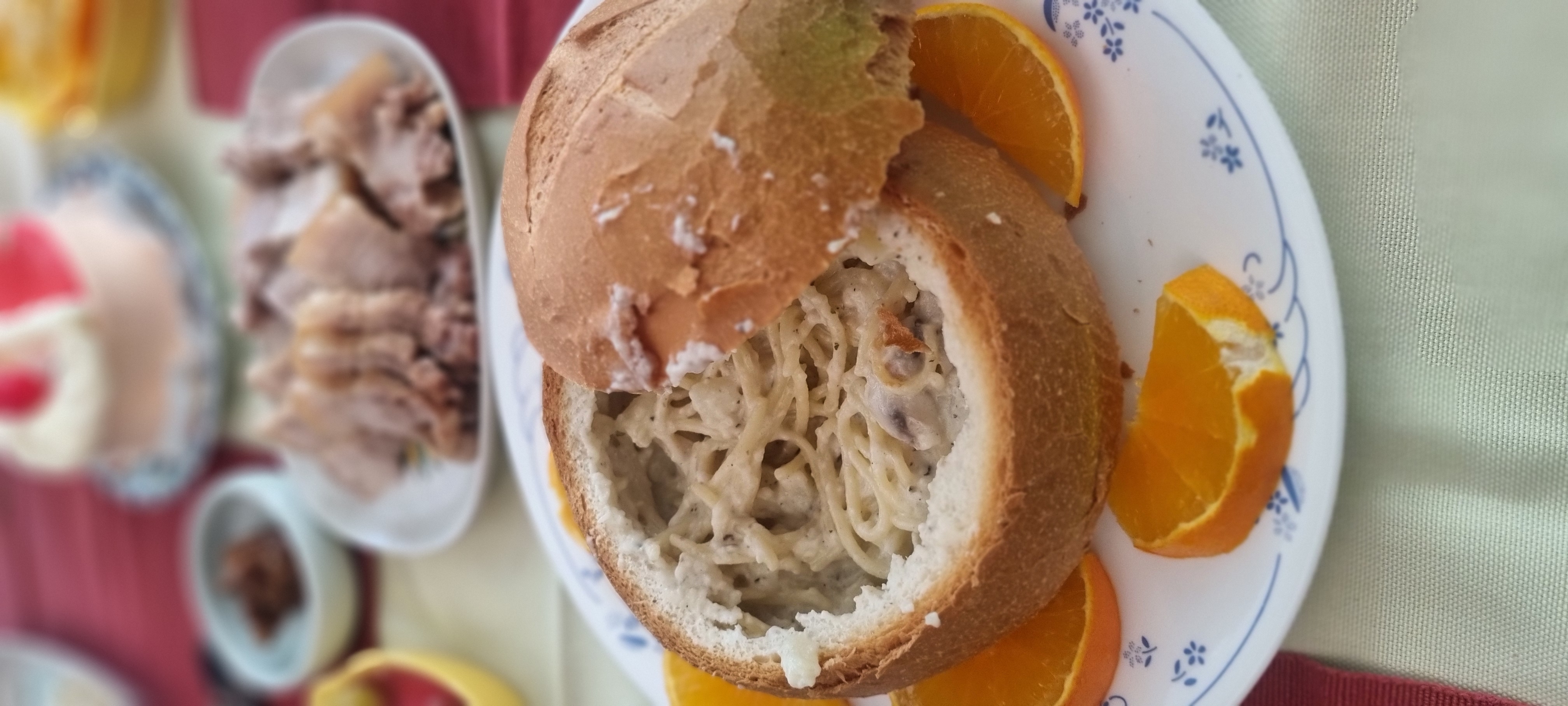 빵 잘라서 속 파고 소스에 면 같이 끓여서 빵 속에 채우기만 하면 되고